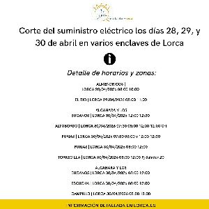 La suspensión temporal de energía eléctrica se llevará a cabo en horario de mañana por mejoras y mantenimiento de la red Lorca, 27 de abril de 2026. El concejal de Servicios Industriales del Ayuntamiento de Lorca, Antonio David Sánchez Alcaraz, ha informado...