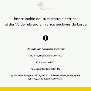 La suspensión temporal de energía eléctrica se llevará a cabo en horario de mañana por mejoras y mantenimiento de la red Lorca, 12 de febrero de 2026. El concejal de Servicios Industriales del Ayuntamiento de Lorca, Antonio David Sánchez Alcaraz, ha informa...