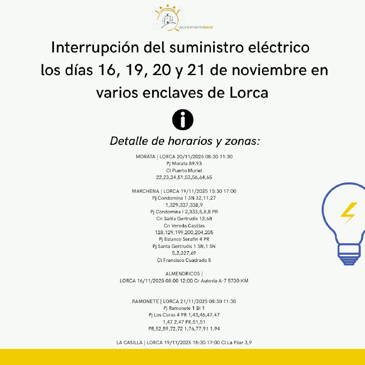 Lorca, 13 de noviembre de 2025. El concejal de Servicios Industriales del Ayuntamiento de Lorca, Antonio David Sánchez Alcaraz, ha informado de la interrupción temporal del suministro de energía eléctrica programada por la empresa Iberdrola para los días 16, 19, 20 y 21 de noviembre en horario de mañana y tarde, en distintas partes de Lorca.