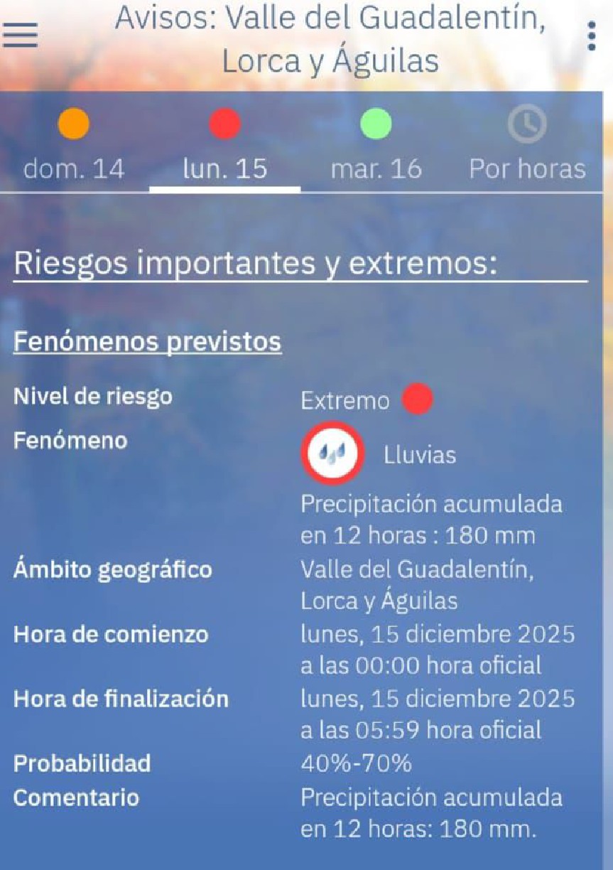 La Agencia Estatal de Meteorología ha informado de aviso de nivel ROJO para el día de hoy (15 de diciembre), por riesgo de lluvias, desde las 00.00 horas, hora oficial, hasta las 05.59 horas para la zona del Noroeste, Valle del Guadalentín, Lorca y Águilas.