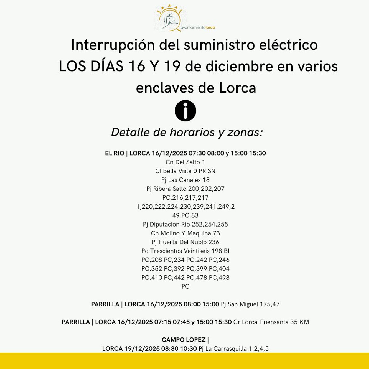 Lorca, 15 de diciembre de 2025. El concejal de Servicios Industriales del Ayuntamiento de Lorca, Antonio David Sánchez Alcaraz, ha informado de la interrupción temporal del suministro de energía eléctrica programada por la empresa Iberdrola para los días 16 y 19 de diciembre en horario de mañana y mediodía, en distintas partes de Lorca.