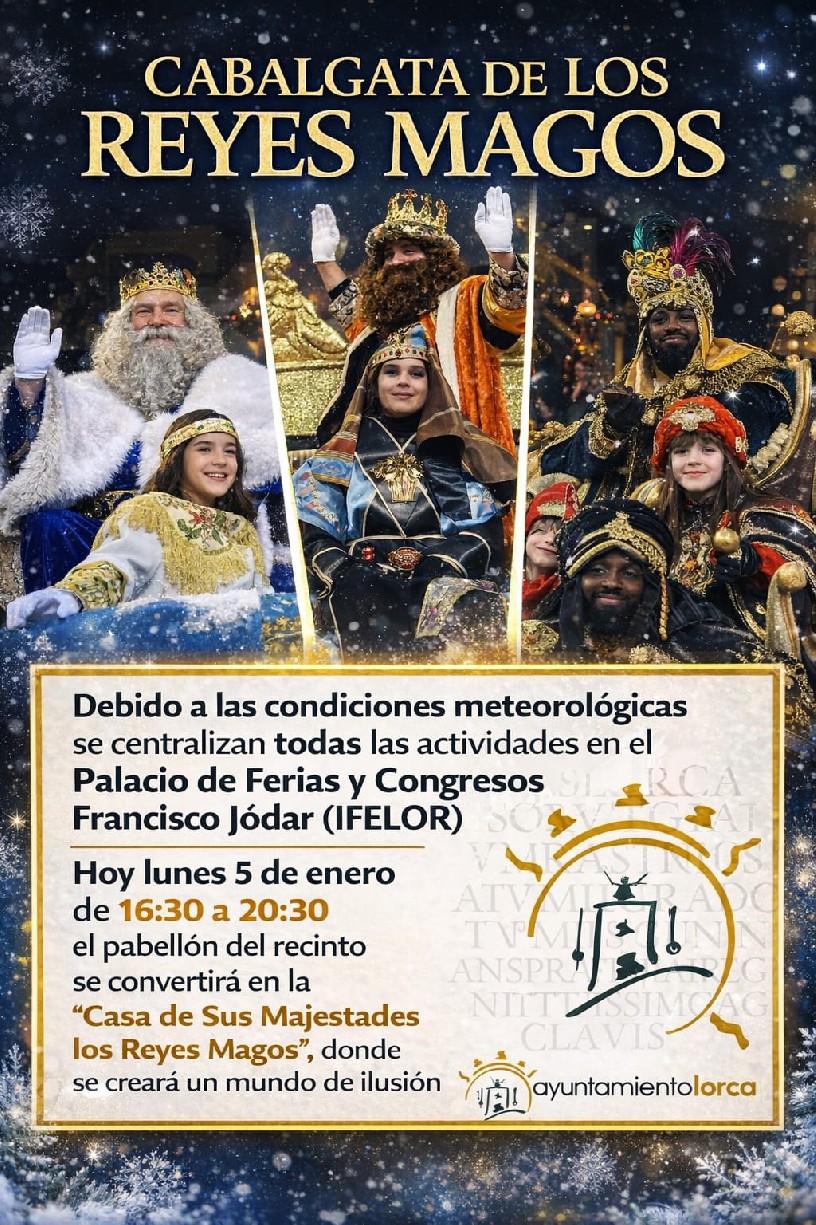 Lorca, 5 de enero de 2026. El Ayuntamiento de Lorca informa de que, tras valorar las previsiones meteorológicas más recientes para la tarde de hoy, tanto de la Agencia Estatal de Meteorología (AEMET) como de empresas privadas especializadas, que señalan un 100% de probabilidad de lluvia, se ha decidido activar el Plan B previsto y trasladar la Gran Cabalgata de Reyes y el resto de actos programados a Palacio de Ferias y Congresos Alcalde Francisco Jódar (IFELOR). De este modo se unifica finalmente en un único recinto cubierto. En el pabellón principal Sus Majestades saludarán a todos los niños y niñas de Lorca, garantizando así que puedan vivir la magia de este día bajo techo y con total seguridad.