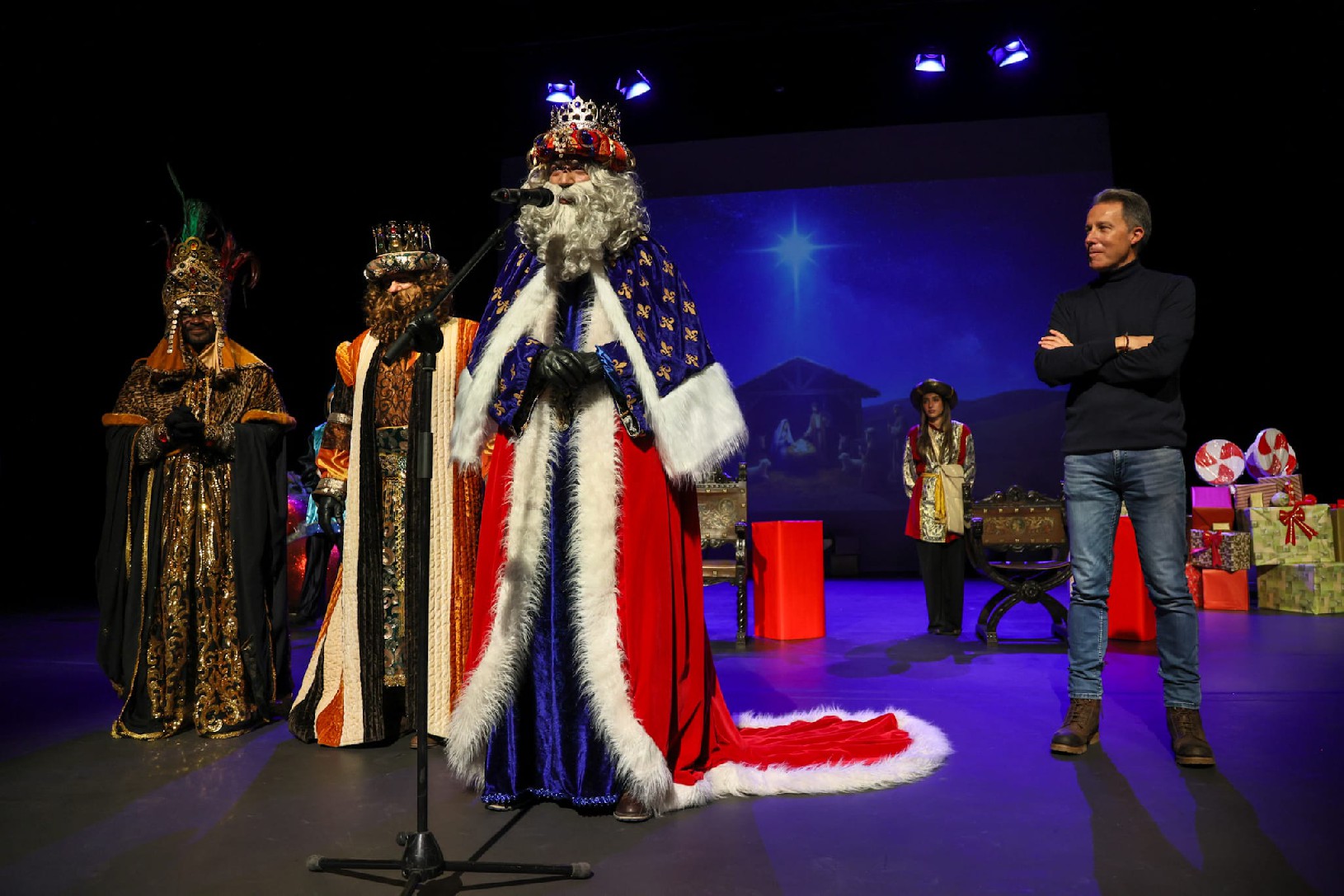 En el escenario, dos gigantescos árboles de Navidad iluminados, decenas de grandes cajas de regalos, bastones y piruletas de caramelo y tres sillas, que han ocupado los Magos de Oriente que, ante la adversidad del tiempo, decidían trasladarse a Lorca para pasar toda la víspera del ‘Día de Reyes’ con los niños de Lorca. En el montaje han participado en los últimos días más de medio centenar de técnicos de sonido, iluminación, escenario y atrezzo, para convertir no sólo el escenario del Auditorio Margarita Lozano, sino varios de los pabellones principales del recinto de Ferias y Congresos Francisco Jódar en un mundo de ilusión donde los más pequeños sean los protagonistas en esta jornada.