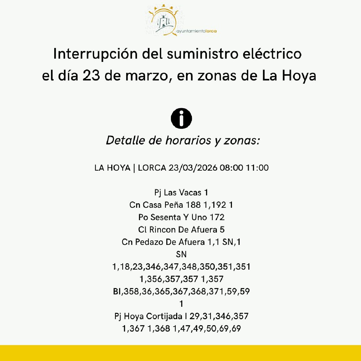 Lorca, 20 de marzo de 2026. El concejal de Servicios Industriales del Ayuntamiento de Lorca, Antonio David Sánchez Alcaraz, ha informado de la interrupción temporal del suministro de energía eléctrica programada por la empresa Iberdrola para el día 23 de marzo en horario de mañana, en La Hoya