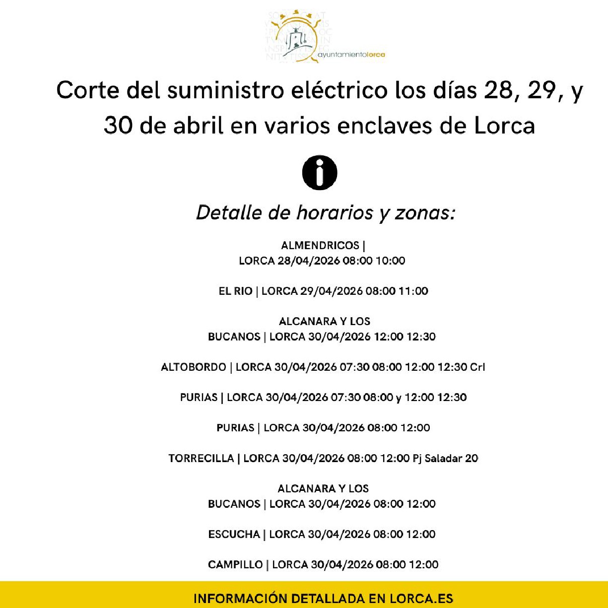 Lorca, 27 de abril de 2026. El concejal de Servicios Industriales del Ayuntamiento de Lorca, Antonio David Sánchez Alcaraz, ha informado de la interrupción temporal del suministro de energía eléctrica programada por la empresa Iberdrola para los días 28, 29 y 30 de abril en horario de mañana, en varios enclaves de Lorca
