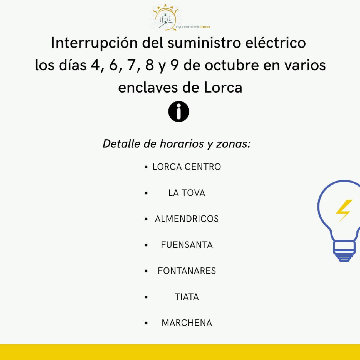 Lorca, 3 de octubre de 2025. El concejal de Servicios Industriales del Ayuntamiento de Lorca, Antonio David Sánchez Alcaraz, ha informado de la interrupción temporal del suministro de energía eléctrica programada por la empresa Iberdrola para los días 4, 6, 7, 8 y 9 de octubre en horario de mañana y tarde, en distintas partes de Lorca.