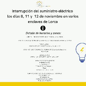Corte del suministro eléctrico los días, 8, 11 y 12 de noviembre en varios enclaves de Lorca La suspensión temporal de energía eléctrica se llevará a cabo en horario de mañana y mediodía por mejoras y mantenimiento de la red Lorca, 6 de noviembre de 2025...