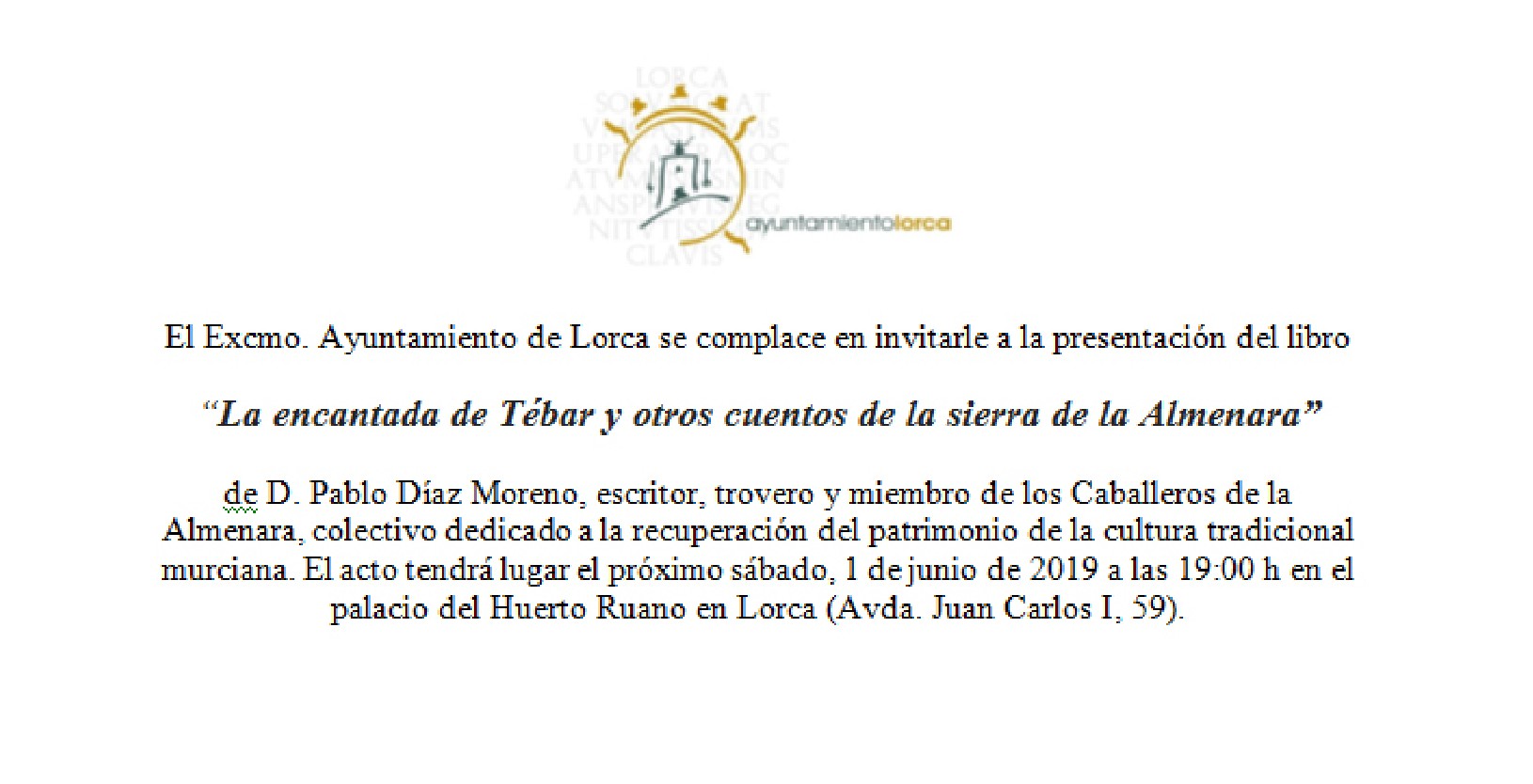 29 de mayo de 2019. El concejal de Cultura en el Ayuntamiento de Lorca, Agustín Llamas, ha informado que el próximo sábado día 1 de junio tendrá lugar la presentación del libro “La encantada de Tèbar y otros cuentos de la Sierra de la Almenara”, obra de Pablo Díaz Moreno, escritor, trovero y miembro de los Caballeros de la Almenara, colectivo dedicado a la recuperación del patrimonio de la cultura tradicional murciana. El acto tendrá lugar a las 19:00 h en el palacio del Huerto Ruano en Lorca.