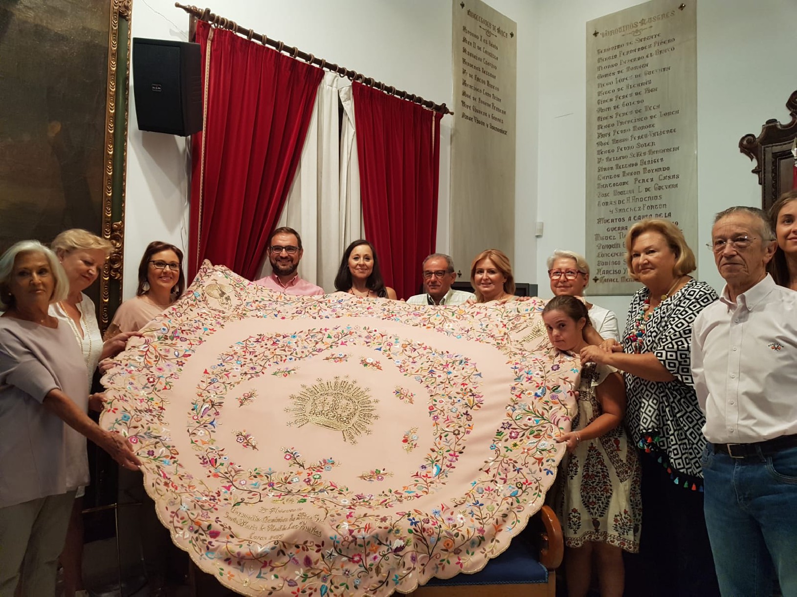 Martínez ha detallado que “durante octubre y diciembre se dibujó el manto, el día 8 de enero se montó el bastidor y se empezó a perfilar y el día 4 de febrero se comenzó con el bordado en lana, un bordado que se terminó el pasado 11 de junio, tras 967 horas de intenso trabajo”.