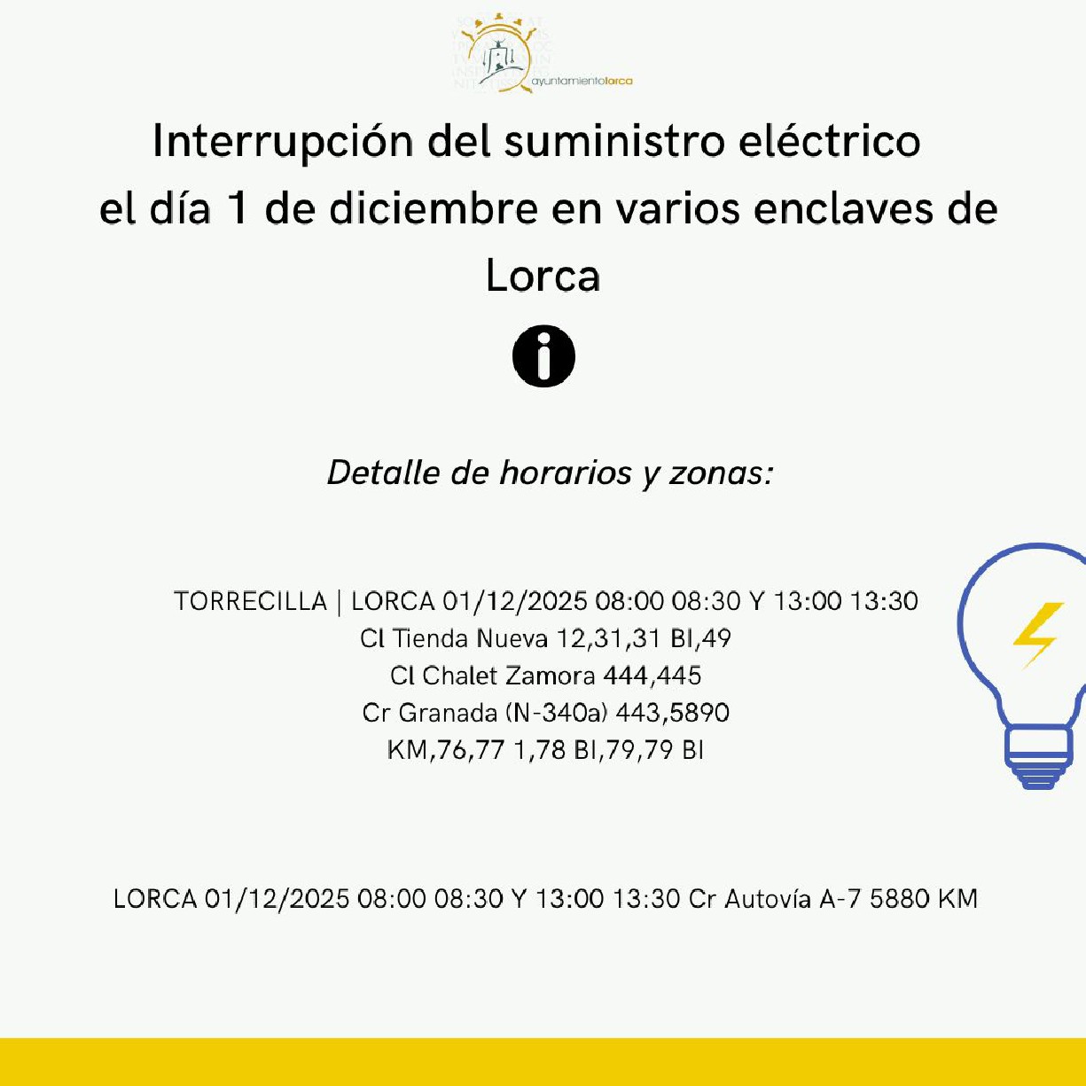 Lorca, 28 de noviembre de 2025. El concejal de Servicios Industriales del Ayuntamiento de Lorca, Antonio David Sánchez Alcaraz, ha informado de la interrupción temporal del suministro de energía eléctrica programada por la empresa Iberdrola para el día 1 de diciembre en horario de mañana, en distintas partes de Lorca.