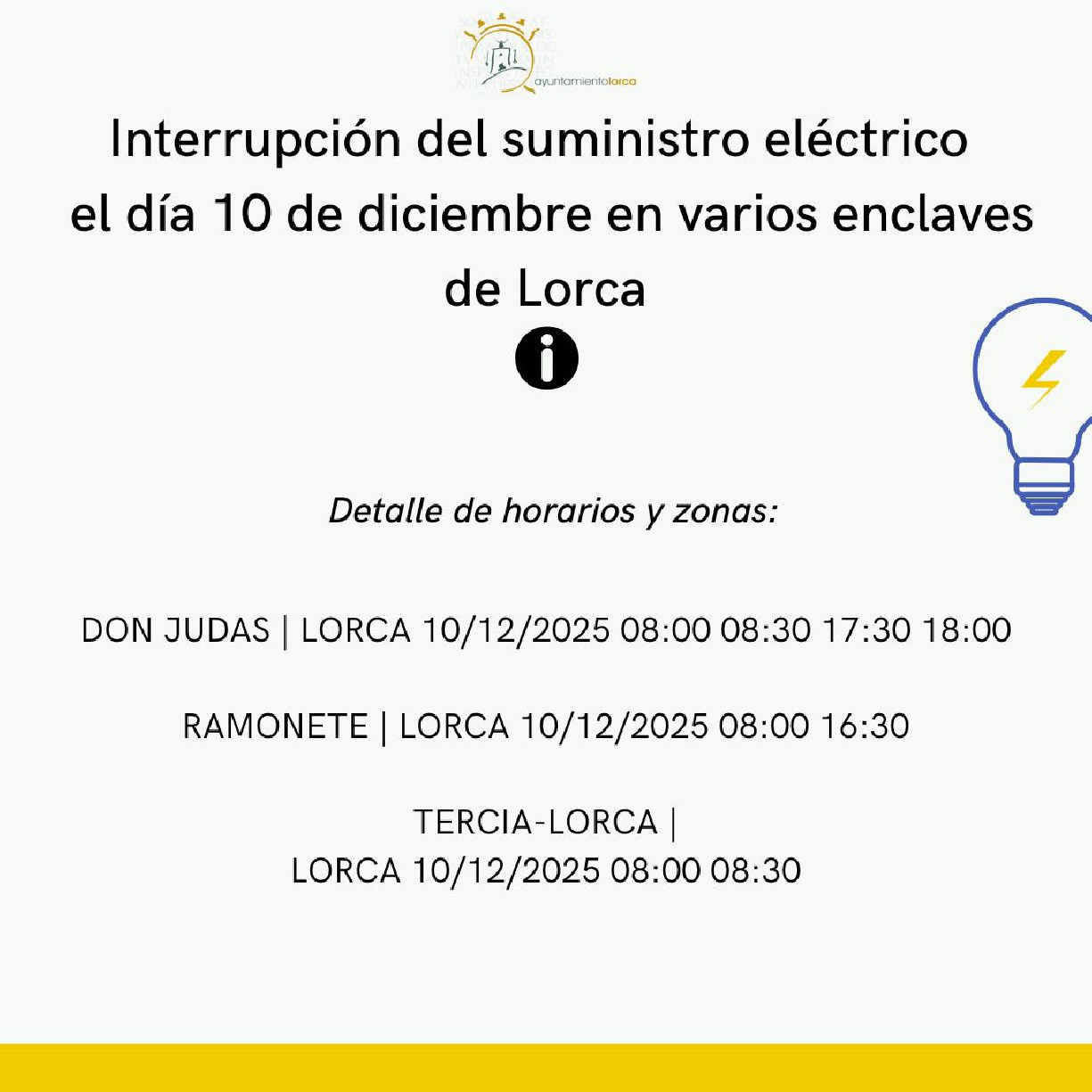 Lorca, 5 de diciembre de 2025. El concejal de Servicios Industriales del Ayuntamiento de Lorca, Antonio David Sánchez Alcaraz, ha informado de la interrupción temporal del suministro de energía eléctrica programada por la empresa Iberdrola para el día 10 de diciembre en horario de mañana y tarde, en distintas partes de Lorca.