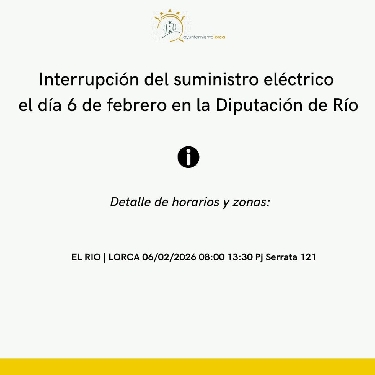 Lorca, 4 de febrero de 2026. El concejal de Servicios Industriales del Ayuntamiento de Lorca, Antonio David Sánchez Alcaraz, ha informado de la interrupción temporal del suministro de energía eléctrica programada por la empresa Iberdrola para el día 6 de febrero en horario de mañana, en la Diputación de Río