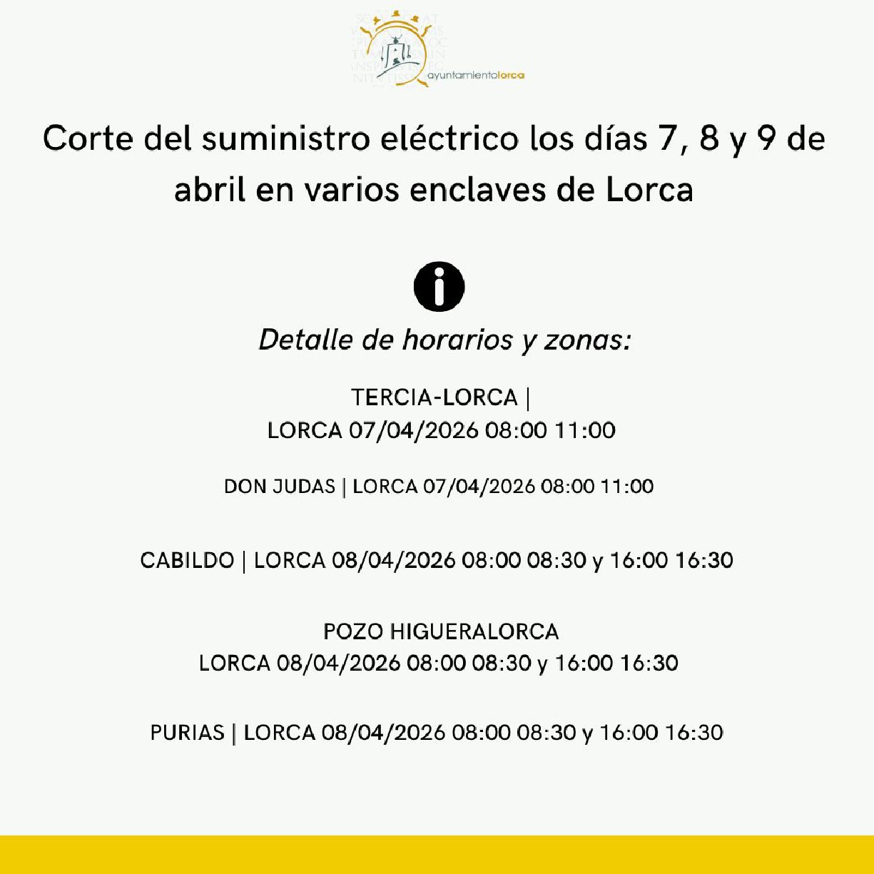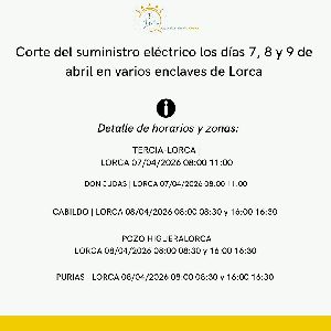Lorca, 6 de abril de 2026. El concejal de Servicios Industriales del Ayuntamiento de Lorca, Antonio David Sánchez Alcaraz, ha informado de la interrupción temporal del suministro de energía eléctrica programada por la empresa Iberdrola para los días 7, 8 y 9 de abril en horario de mañana y tarde, en varios enclaves de Lorca
