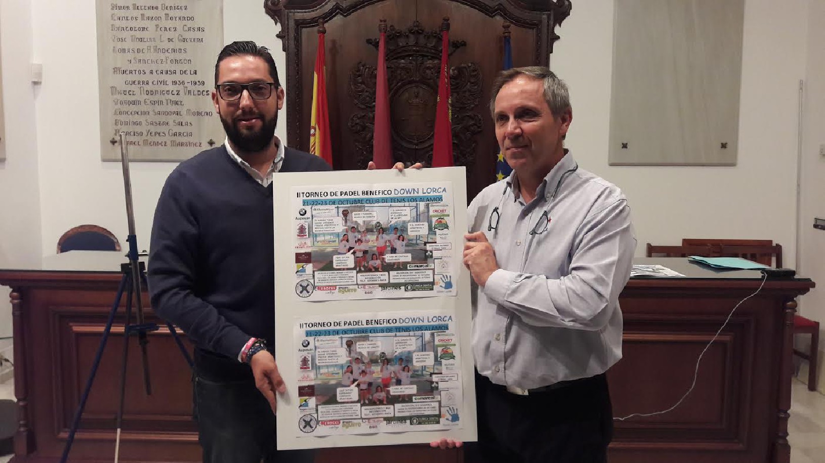 13 de octubre de 2016. El Concejal de Deportes del Ayuntamiento de Lorca, Juan Francisco Martínez Carrasco, ha presentado esta mañana junto a José Ortuño, presidente de la Asociación Down Lorca, el II Torneo de Pádel “Down Lorca” que se organiza a beneficio de esta entidad, y que pretende convertirse en un referente a nivel local.